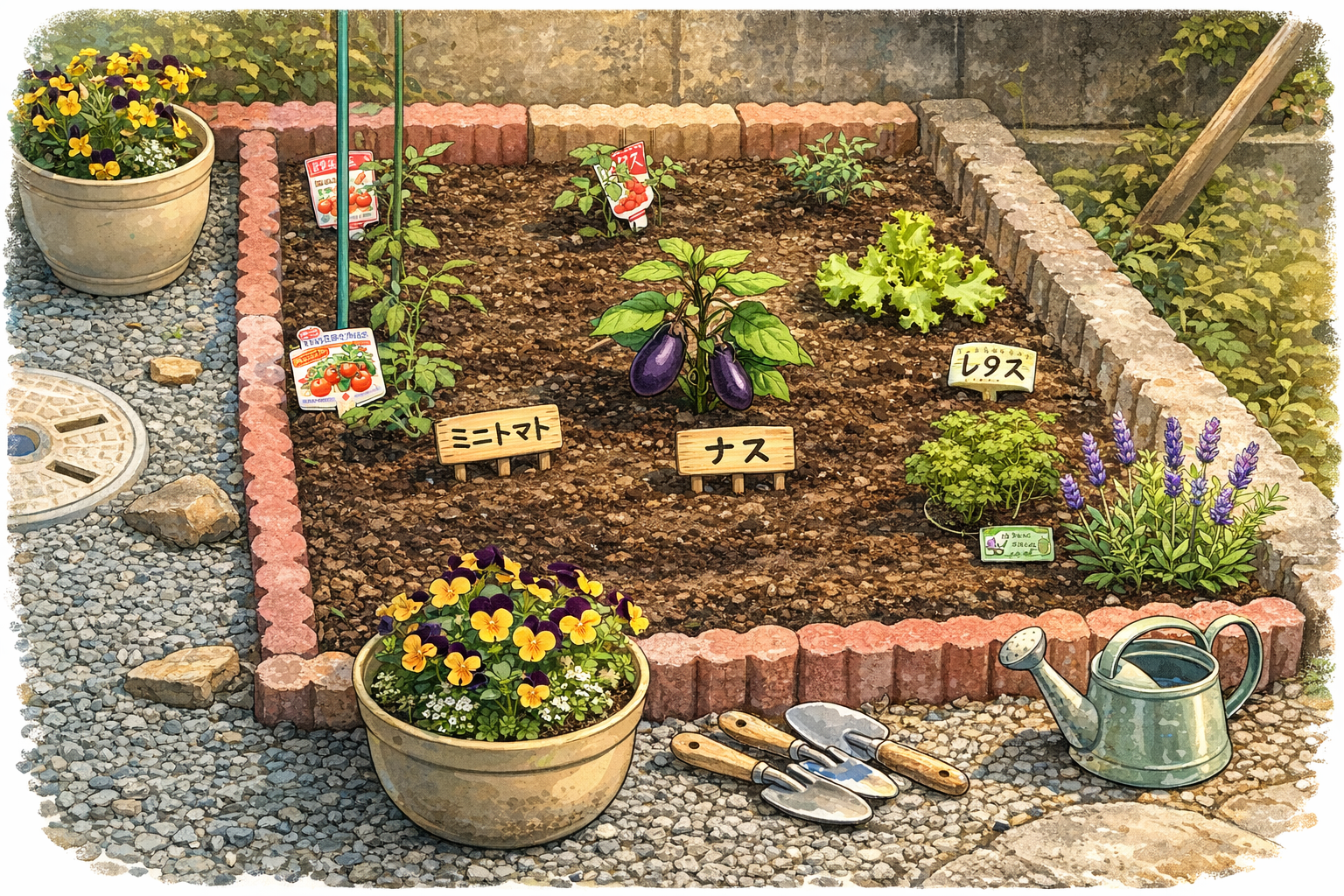今回植えたのは、昨年も育てたミニトマトに加えて、新たにナスとスナックエンドウ。そして少し趣向を変えて、ラベンダーなどのハーブも取り入れてみた。