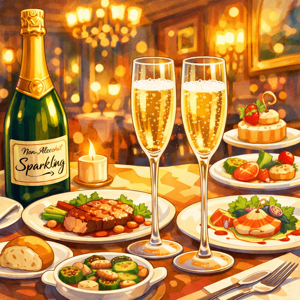以前はこうした場ではワインを楽しむこともあったが、最近はお酒を控えているため、今回はノンアルコールのスパークリングワインを選んだ。グラスに注がれた泡が立ち上る様子を見ていると、それだけで十分に特別な気分になる。アルコールでなくても、こうして雰囲気を楽しめるのは新しい発見だった。